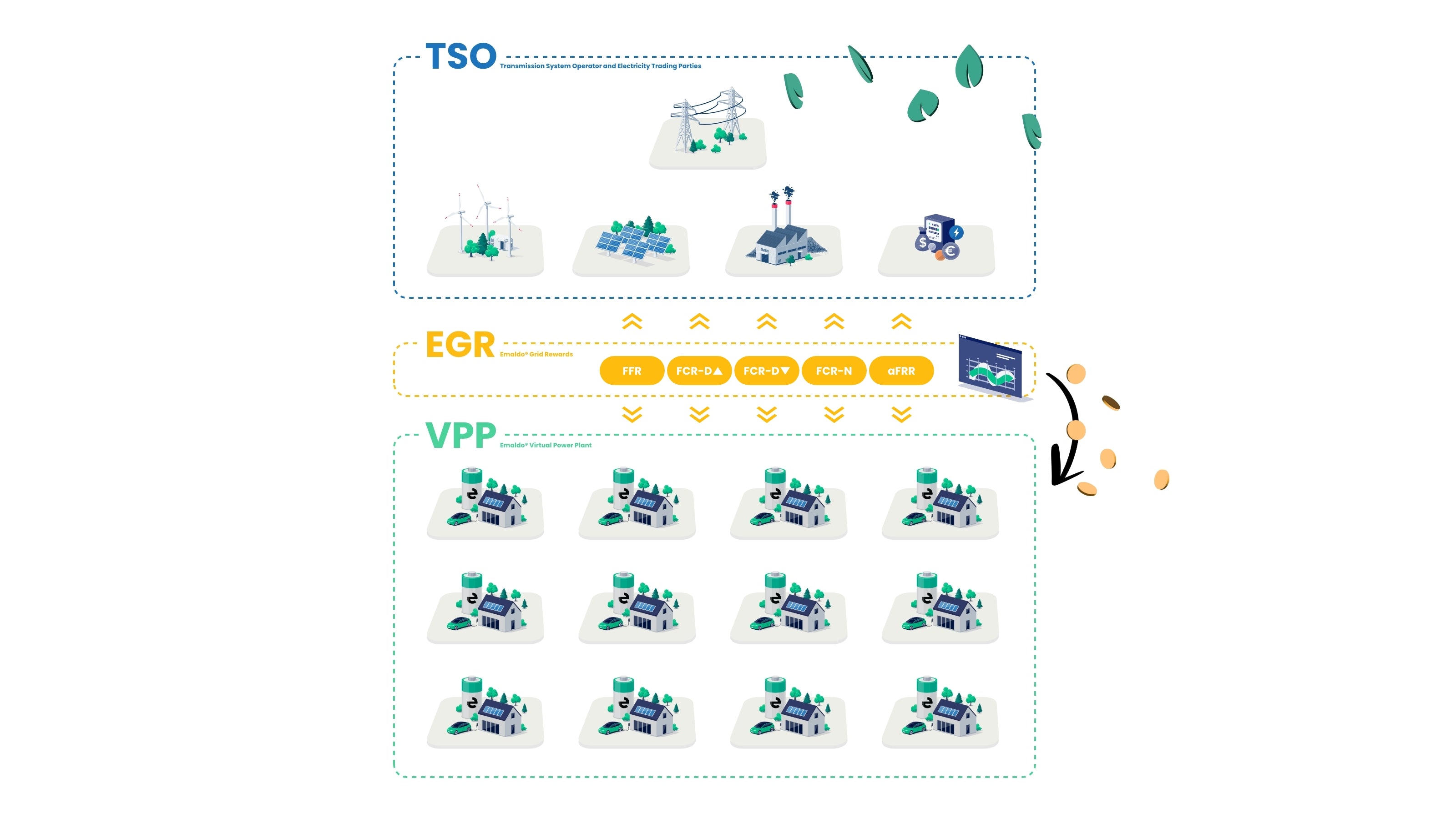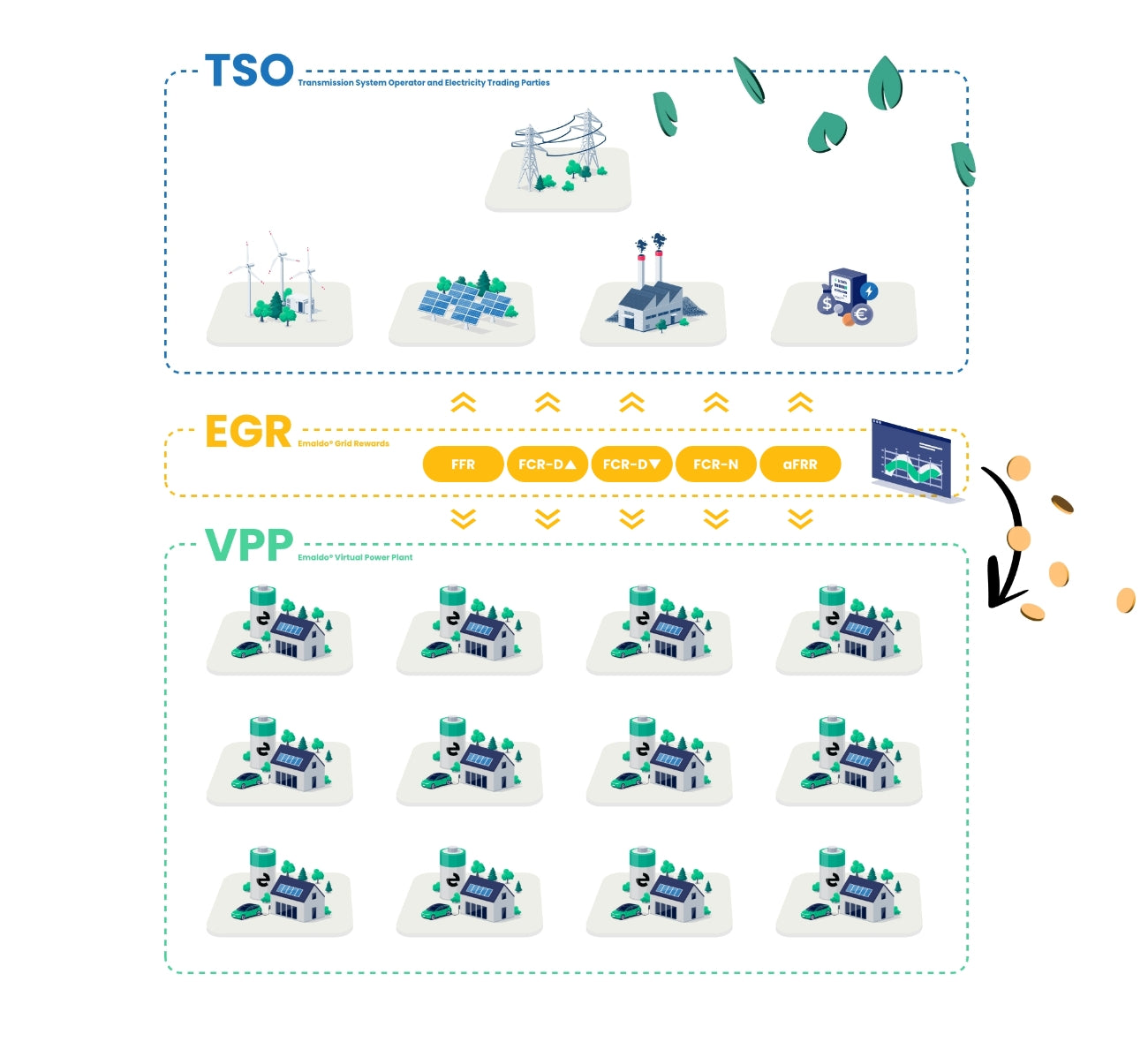 Emaldo leverages the giant battery created by virtually connecting all Emaldo systems and constantly bid on the TSO requests.